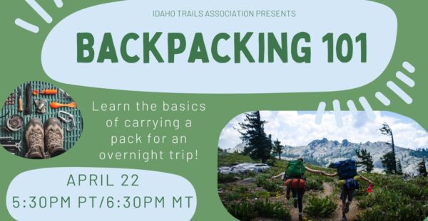 Join avid backpacker and Idaho Trails Association Crew Leader Alisa Rettschlag for an engaging presentation on how to prepare for your next backcountry adventure. Whether you’re planning a day hike, an overnight backpacking trip, or a weekend campout, you’ll leave feeling confident, capable, and excited to get outdoors.